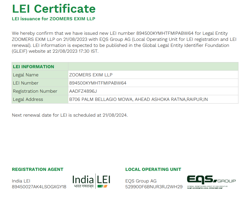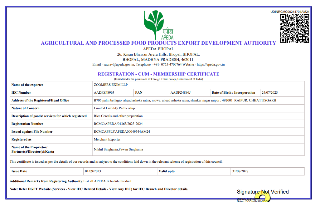 Our Certifications Home / Our Certifications APEDA RCMC (Registration-Cum-Membership Certificate) View PDF LEI Certificate (Legal Entity Identifier Certificate) View PDF FSSAI (Food Safety and Standards Authority of India) View Certificate US FDA Food Facility Registration (Foreign Registration) View Certificate
